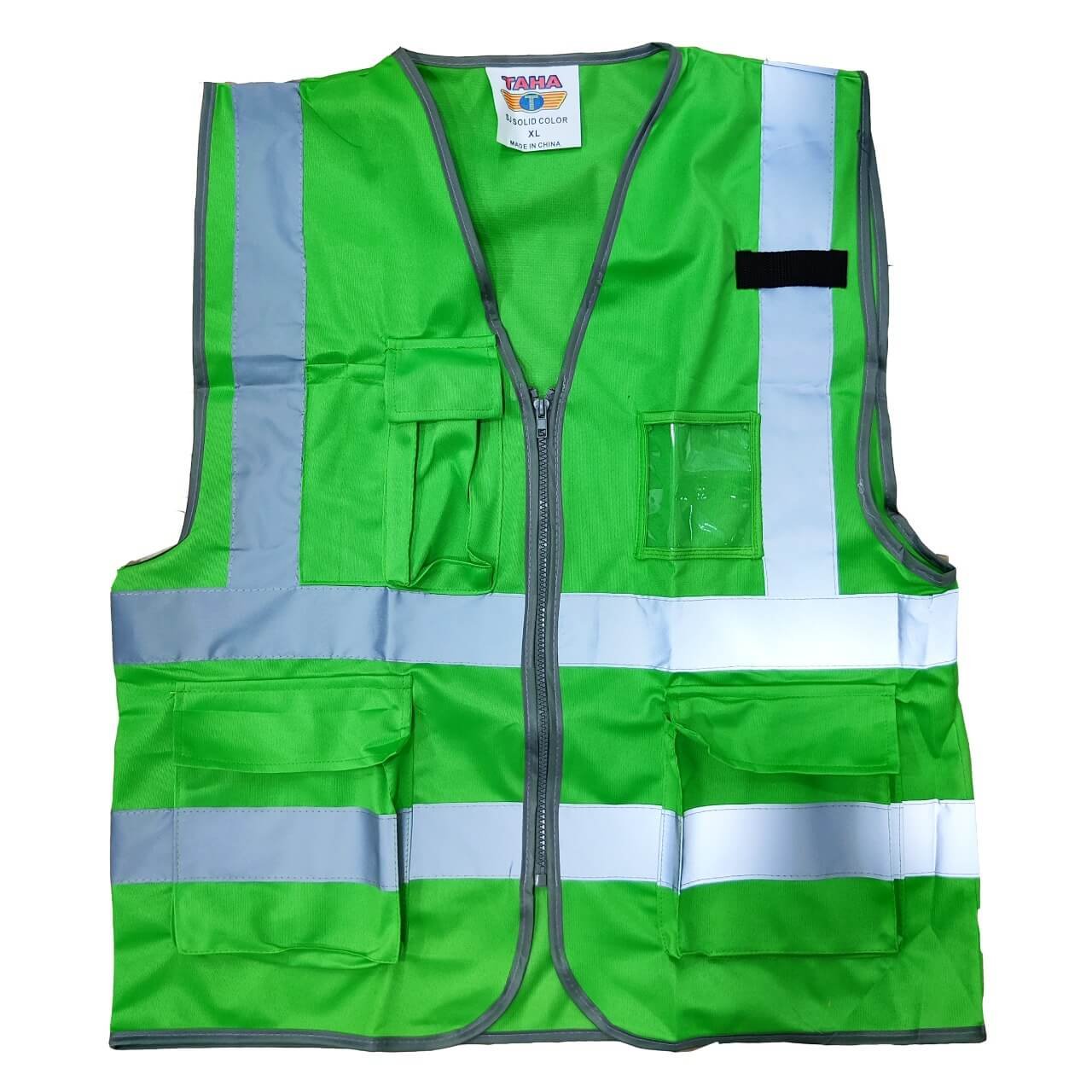 Safety Vest with 120 gsm , 4 line reflective tape, zipper and id pocket. Solid colors.