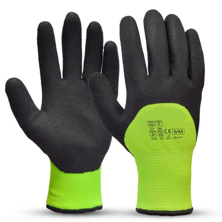 Seamless knit acrylic fleece lined glove, Nitile foam coating with sandy finish. High abrasion resistant ANSI ABR 4 & ANSI CUT A2. Excellent grip in wet or oily applications.